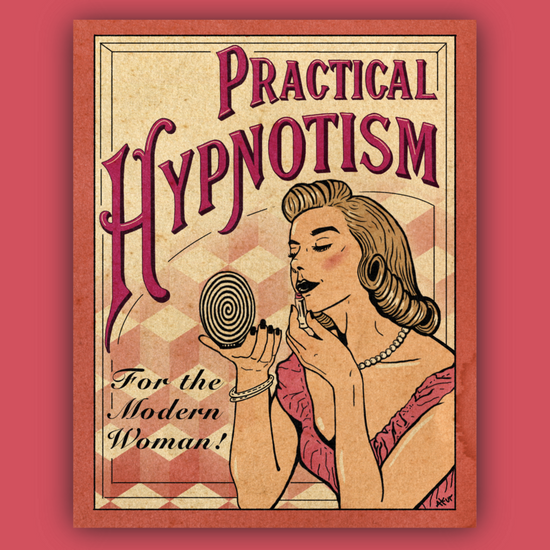 This artwork is a play off a series of pamphlets and books that were published in the 1950's, which claimed to teach husbands practical techniques to hypnotize their troublesome wives. I'm not kidding about that. In my version, the guide is for the modern woman, although it's up to you to decide if she's hypnotizing herself or the world around her.